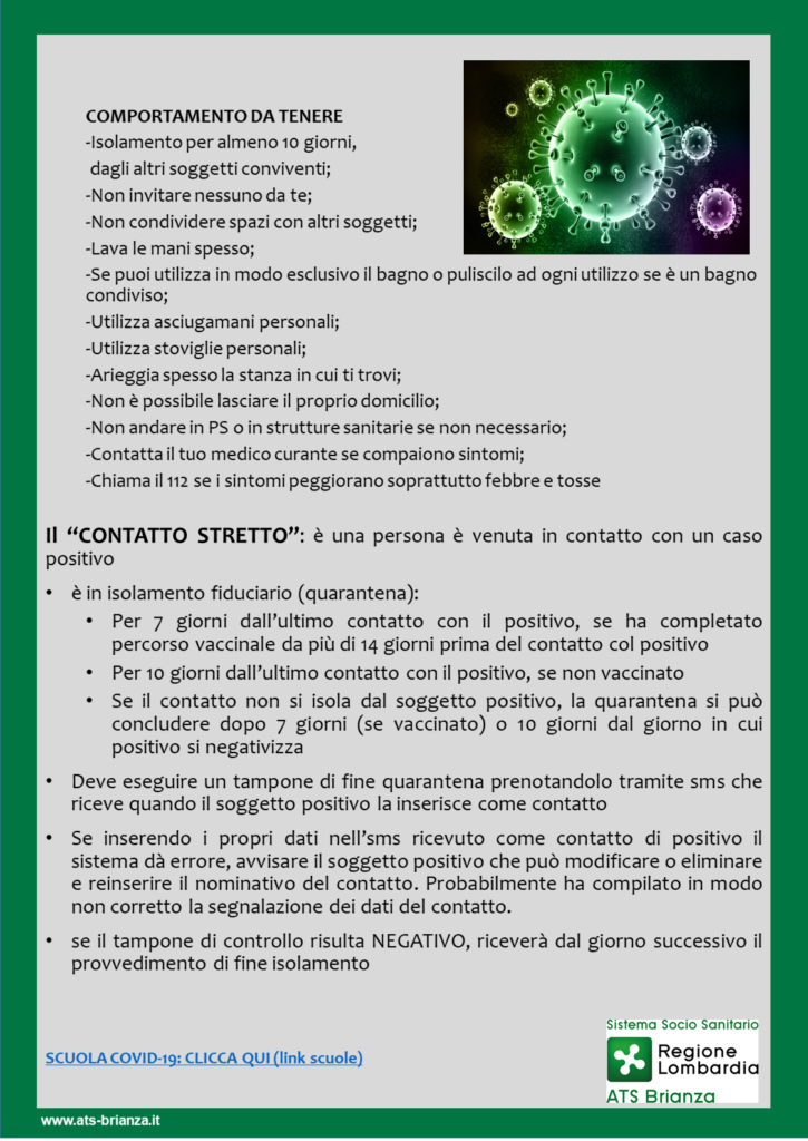Sul sito web di ATS Brianza sono disponibili chiare indicazioni su cosa fare nel caso di positività a COVID 19.