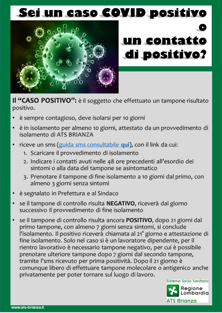 Sul sito web di ATS Brianza sono disponibili chiare indicazioni su cosa fare nel caso di positività a COVID 19.